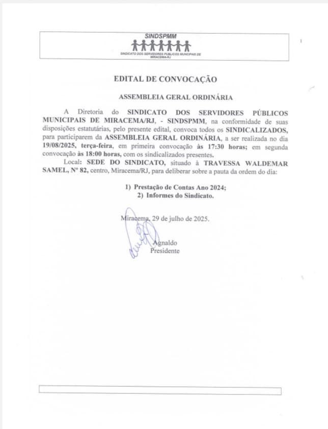A Diretoria do SINDICATO DOS SERVIDORES PÚBLICOS MUNICIPAIS DE MIRACEMA/RJ - SINDSPMM, na conformidade de suas disposições estatutárias, pelo presente edital, convoca todos os SINDICALIZADOS, para participarem da ASSEMBLEIA GERAL ORDINÁRIA, a ser realizada no dia 19/08/2025, terça-feira, em primeira convocação às 17:30 horas; em segunda convocação às 18:00 horas, com os sindicalizados presente.